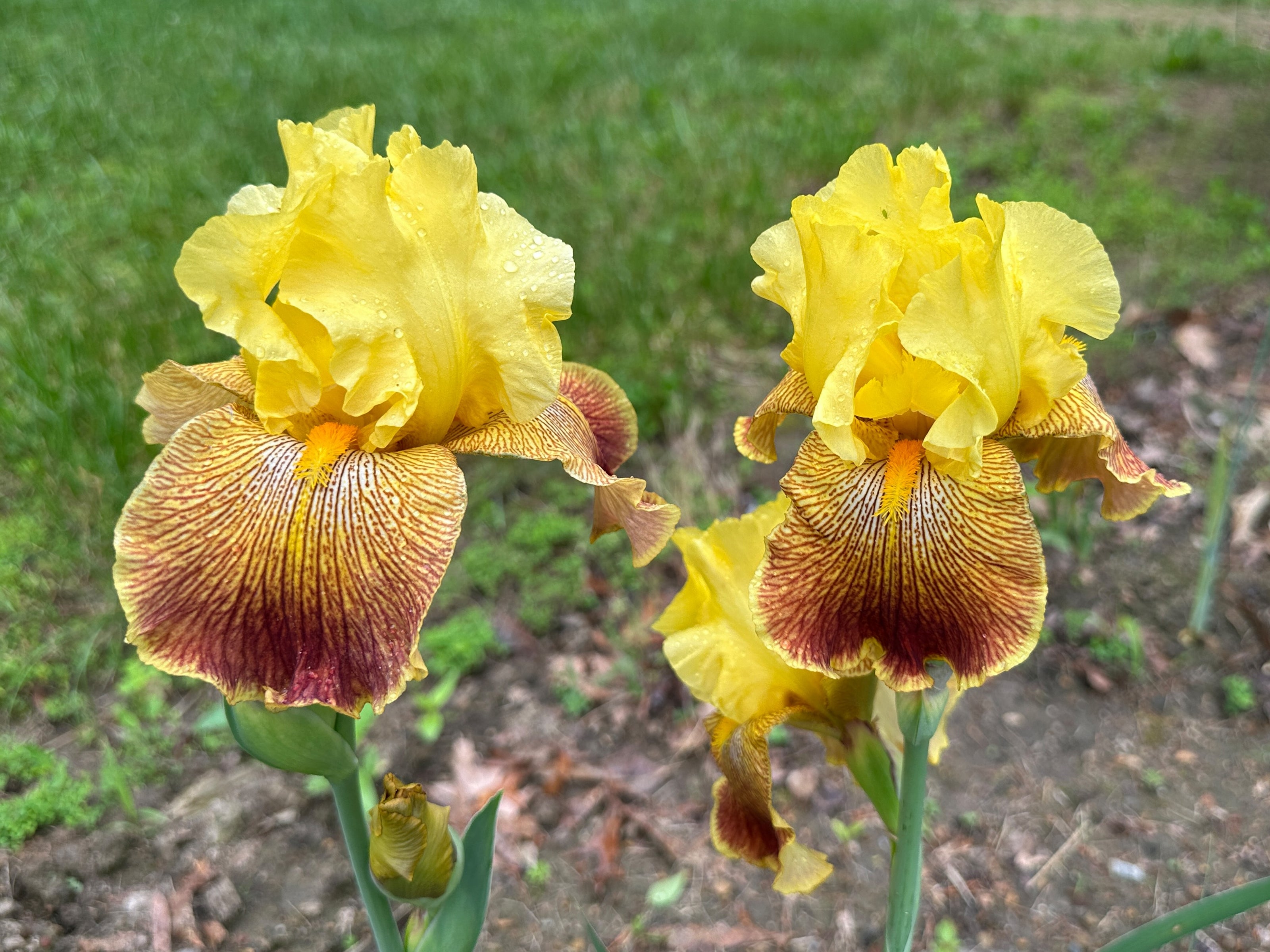 The parking lot is flat and there are grass paths between the iris gardens and rows. However, depending on the weather, the paths can get muddy. Some of the garden is on a hill as well.