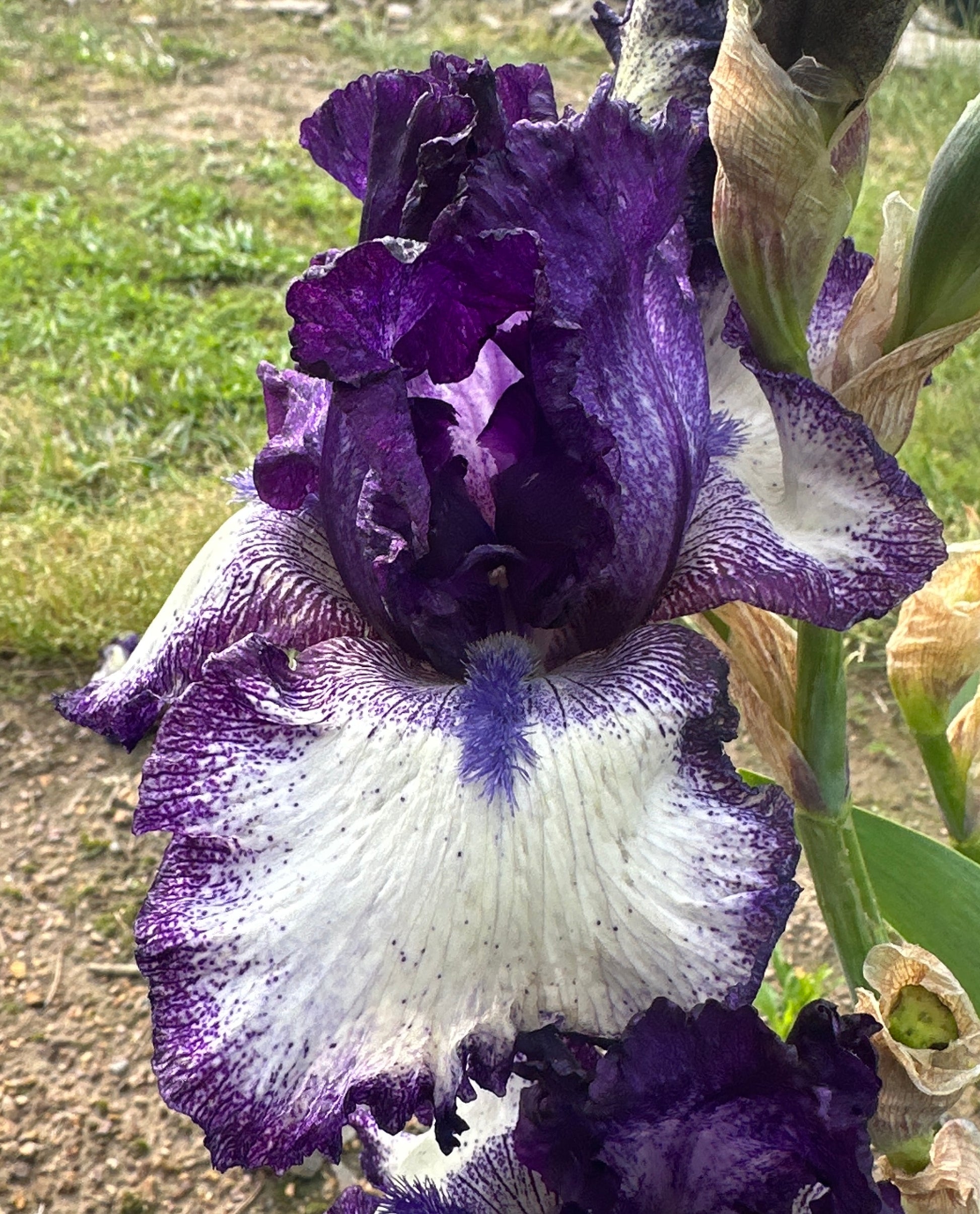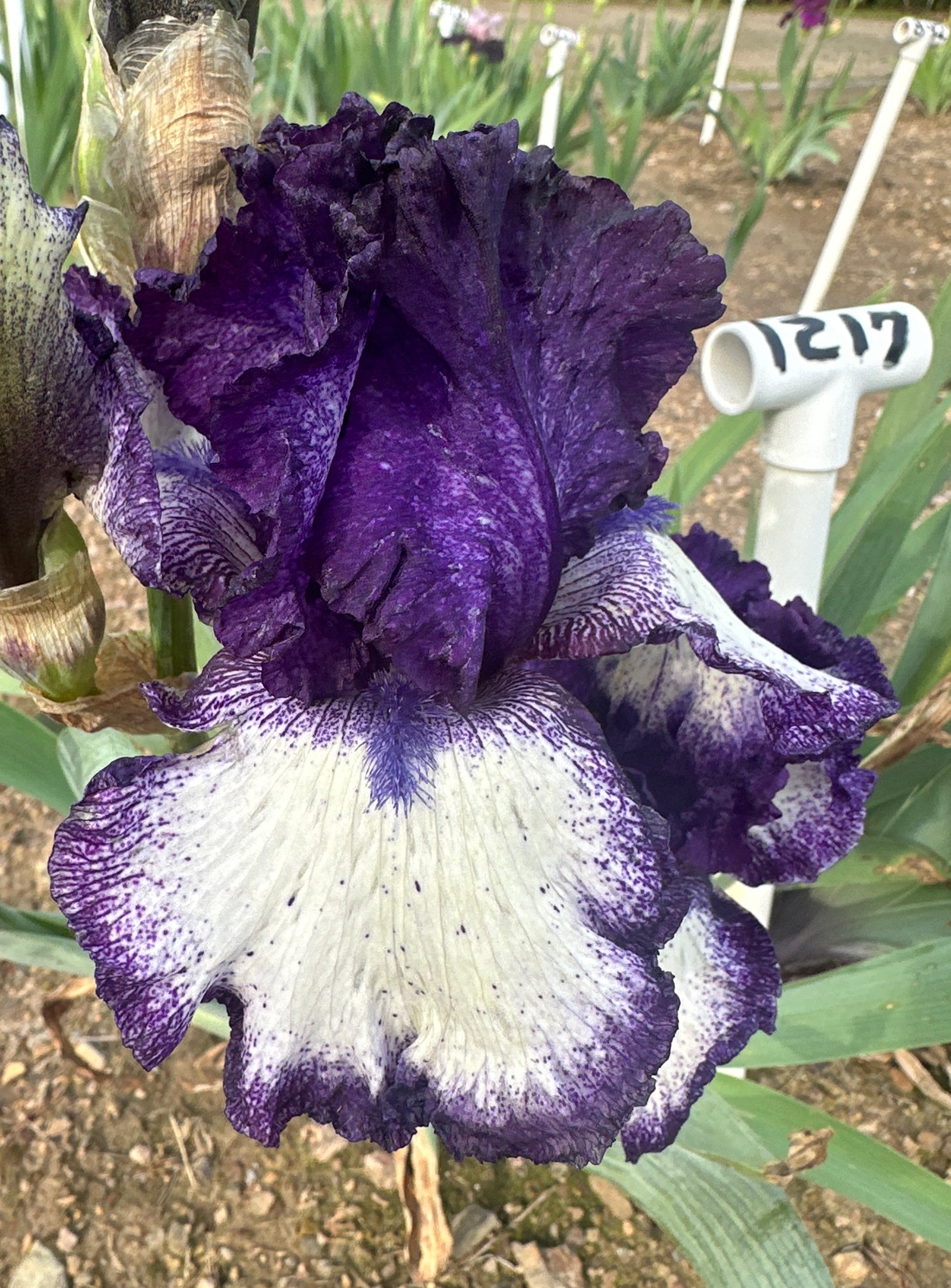 Grapetizer - (Thomas Johnson, R. 2009). Seedling# TW139YY. TB, 35" (89 cm). Midseason bloom. Standards dark black-purple, slight white ground visible in center; style arms near black; falls pristine white, 1-inch purple-black plicata bands and dotting, sparse peppering over centers, thin dart at end of dark-purple-black beards; purple-based foliage; musky fragrance. Parentage: 'Storm Track' X 'Blackberry Tease'. Introduced by Mid-America in 2009. Awards: Honorable Mention 2011; Award of Merit 2013.