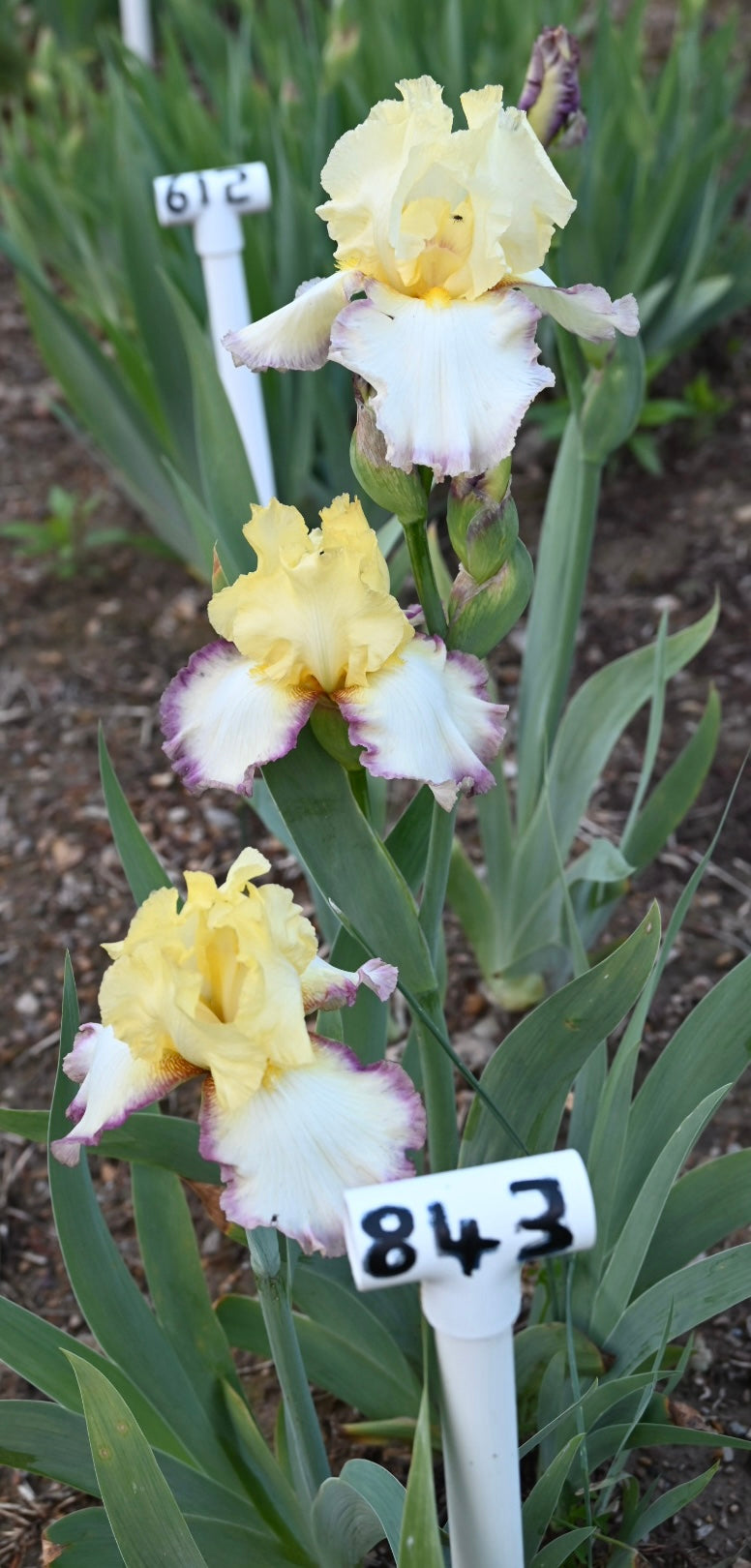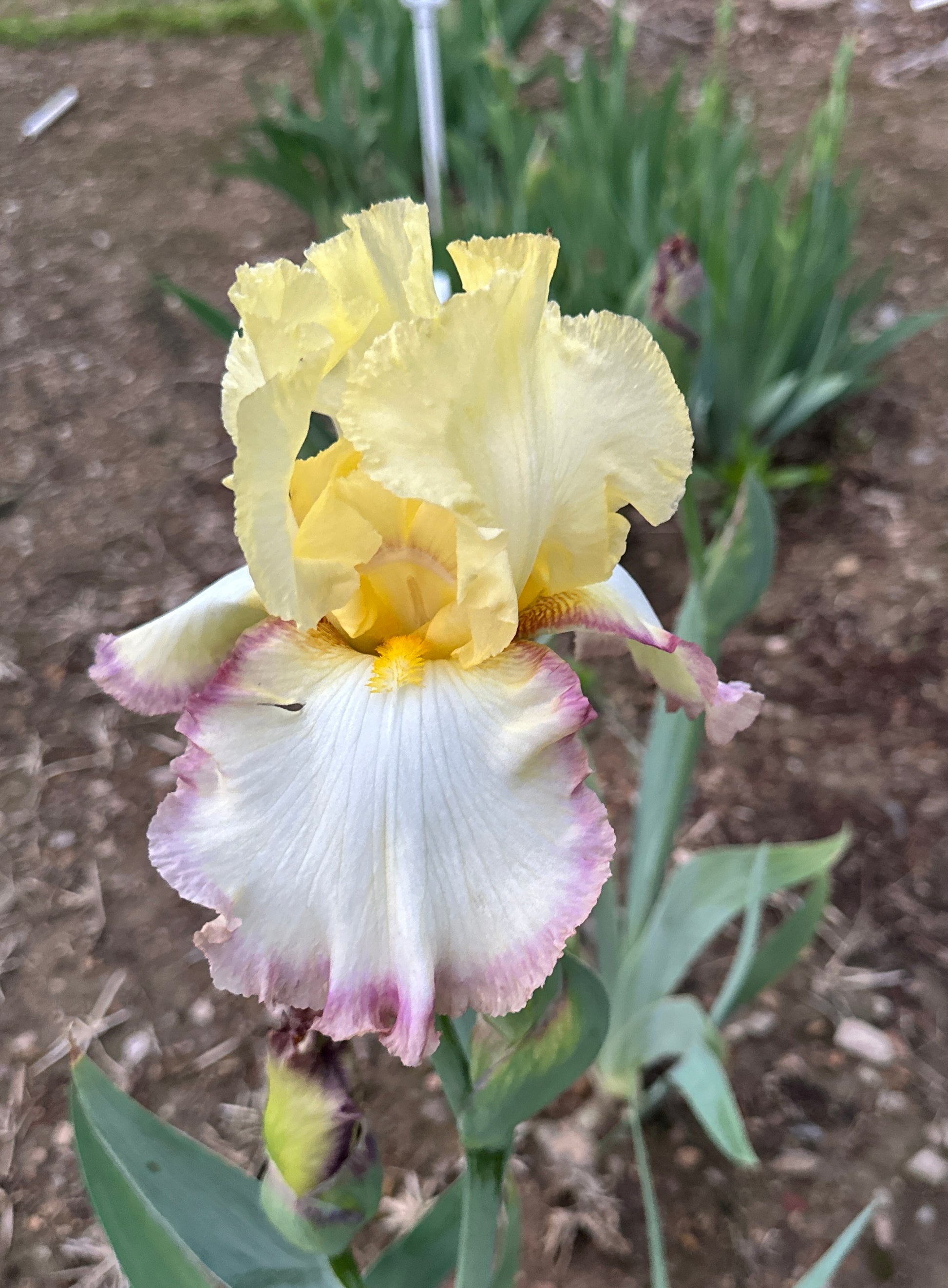 Gypsy Woman - (Schreiner, R. 1985). Seedling# R 329-1. TB, 35" (89 cm). Early to midseason bloom. Standards luminescent light yellow; falls cream white, edged rose orchid; mid-yellow beard; ruffled. Parentage: Seedling# H238-A: (('Champagne Music' x seedling# B 701-1) x ('Orchid Brocade' x seedling# A 868-1)) X 3 generations of involving crosses of flamingo-rose and pink seedlings and 'Emma Cook'. Introduced by Schreiner in 1985. Awards: High Commendation 1984; Honorable Mention 1987; Award of Merit 1991. Rebloom reported in: Ontario. USDA Zones 5.