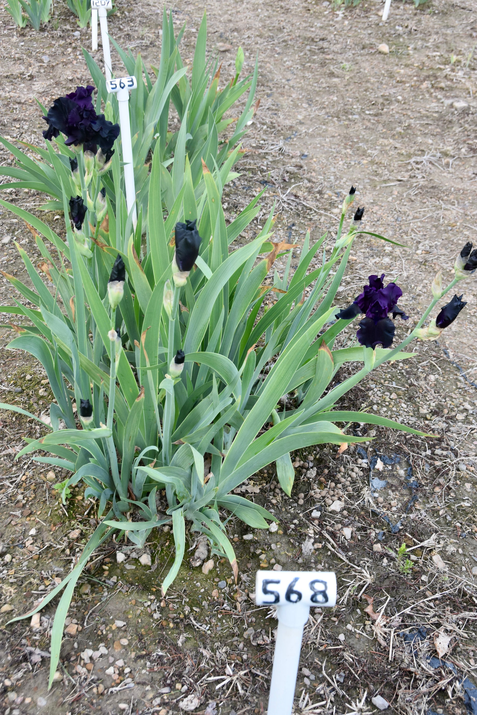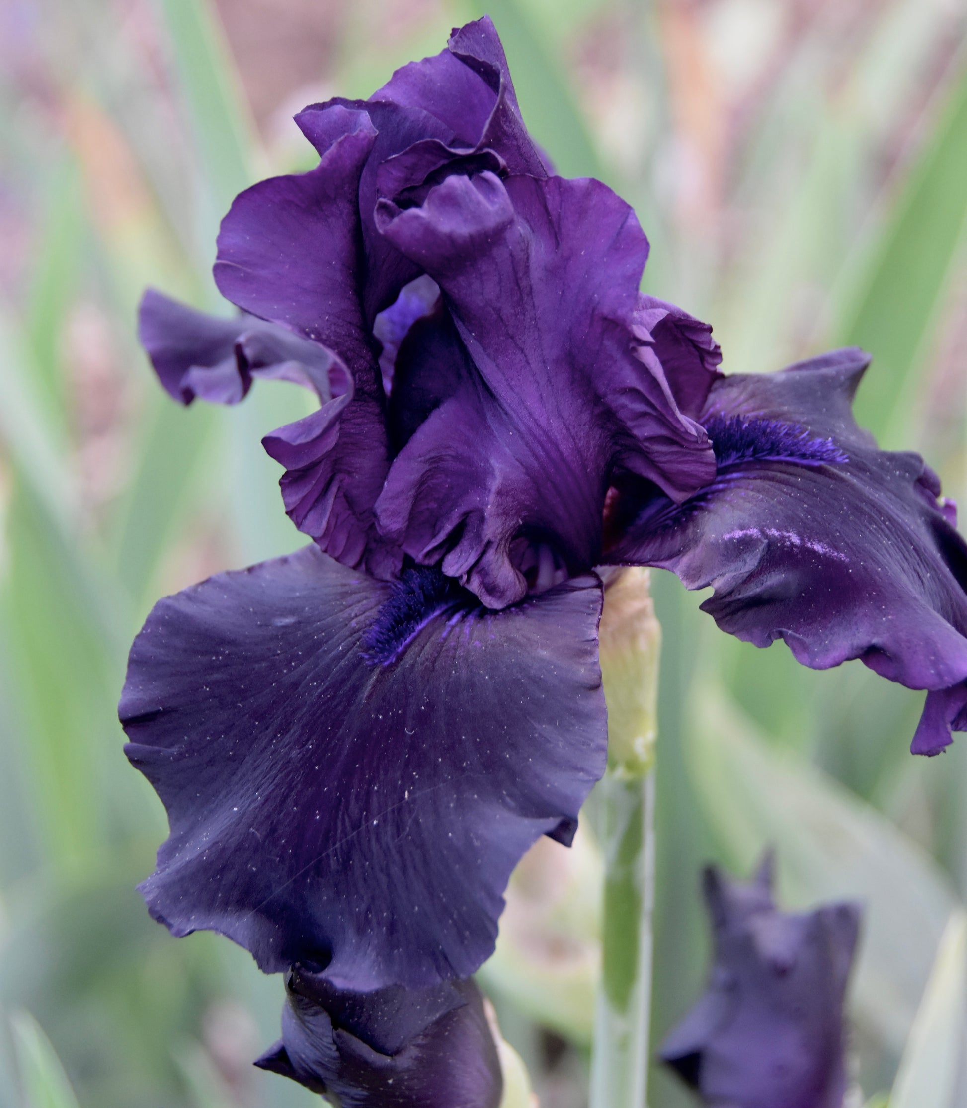 Hello Darkness - (Schreiner, R. 1992). Seedling# Y 882-1. TB, 37" (94 cm), Early to midseason bloom. Ruffled purple black (RHS 202A) self; beards black. Parentage: Seedling# R 124-4: (seedling# M 229-C: (((( 'Allegiance' x (( 'Envoy' seedling x 'Black Castle') x seedling# L 474-J: (( 'Blue Glow' x 'Black Belle') x 'Storm Warning'))) x 'Black Swan' seedling) x 'Navy Strut') x ((((( 'Black Mischief' x ( 'Black Forest' x 'Starless Night')) x seedling# L 474-J) x 'Black Swan') x 'Matinata') x 'Navy Strut')) x 'Titan's Glory') X 'Midnight Dancer'. Schreiner 1992. Honorable Mention 1994; Walther Cup 1994; Award of Merit 1996; Favorite Guest Iris 1996; Wister Medal 1998; American Dykes Medal 1999. Rebloom reported in: KY. USDA Zones 6.