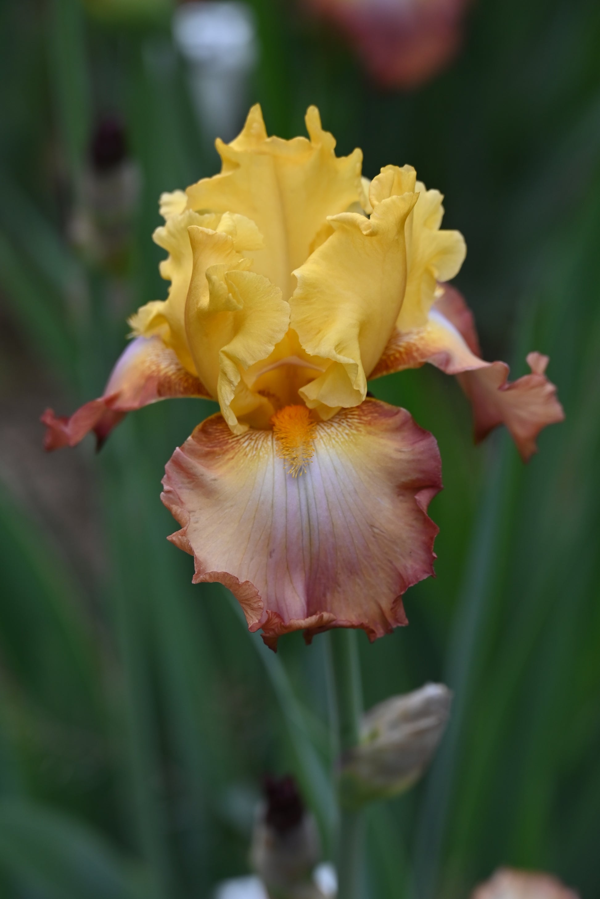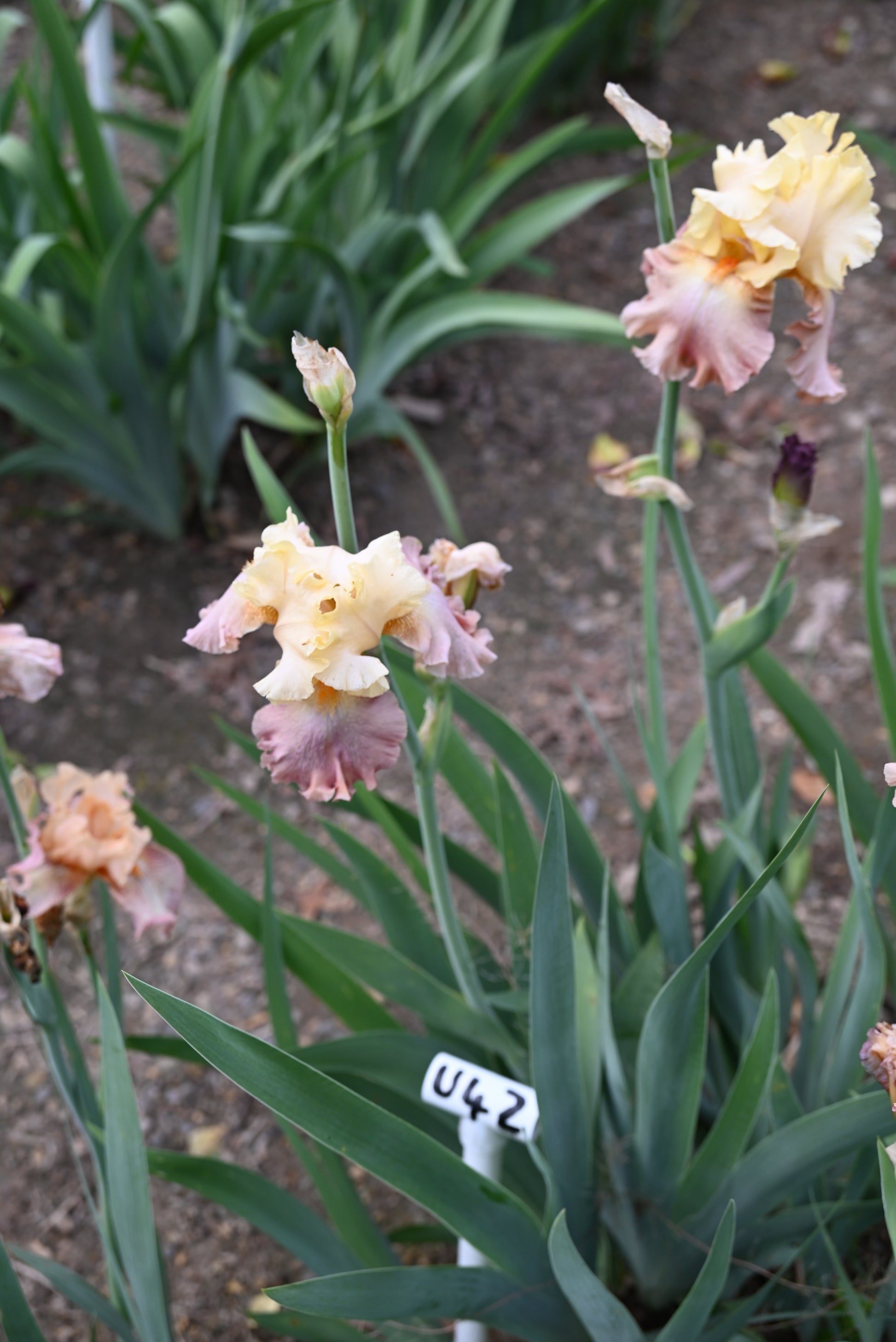 High Chaparral (Schreiner, R. 2006). Seedling# JJ 765-C. TB, 36" (91 cm), Midseason to late bloom. Standards yellow (RHS 14C); falls tan (31C) banded rose; beards yellow tipped orange; ruffled. 'Harvest Faire' X 'Wayside's Apricot Delite'. Schreiner 2006. President's Cup 2006, Favorite Guest 2006; Honorable Mention 2008; Award of Merit 2010; Prize winner of Moscow International TB Iris Competition 2010 (second place).