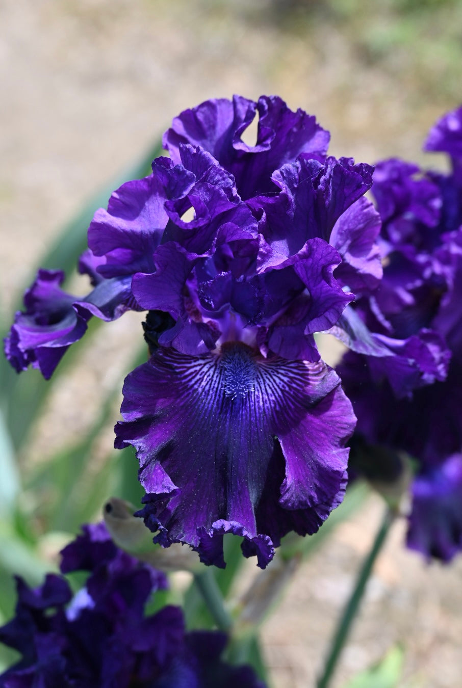 Hollywood Nights - (Roger Duncan, R. 2000). Seedling# 3-W-26-3. TB, 32" (81 cm), Midseason bloom. Intense deep purple-black, falls with darker sheen on ruffles, small white spray pattern near beard; style arms blue-violet; beards blue-violet, dark burnt orange in throat; heavily ruffled, laced; sweet fragrance. Parentage: 'Dusky Challenger' X seedling# 1-M-37-24: ('Spin-Off' x 'Street Walker'). Superstition 2001. Honorable Mention 2003; Award of Merit 2005; Wister Medal 2008.