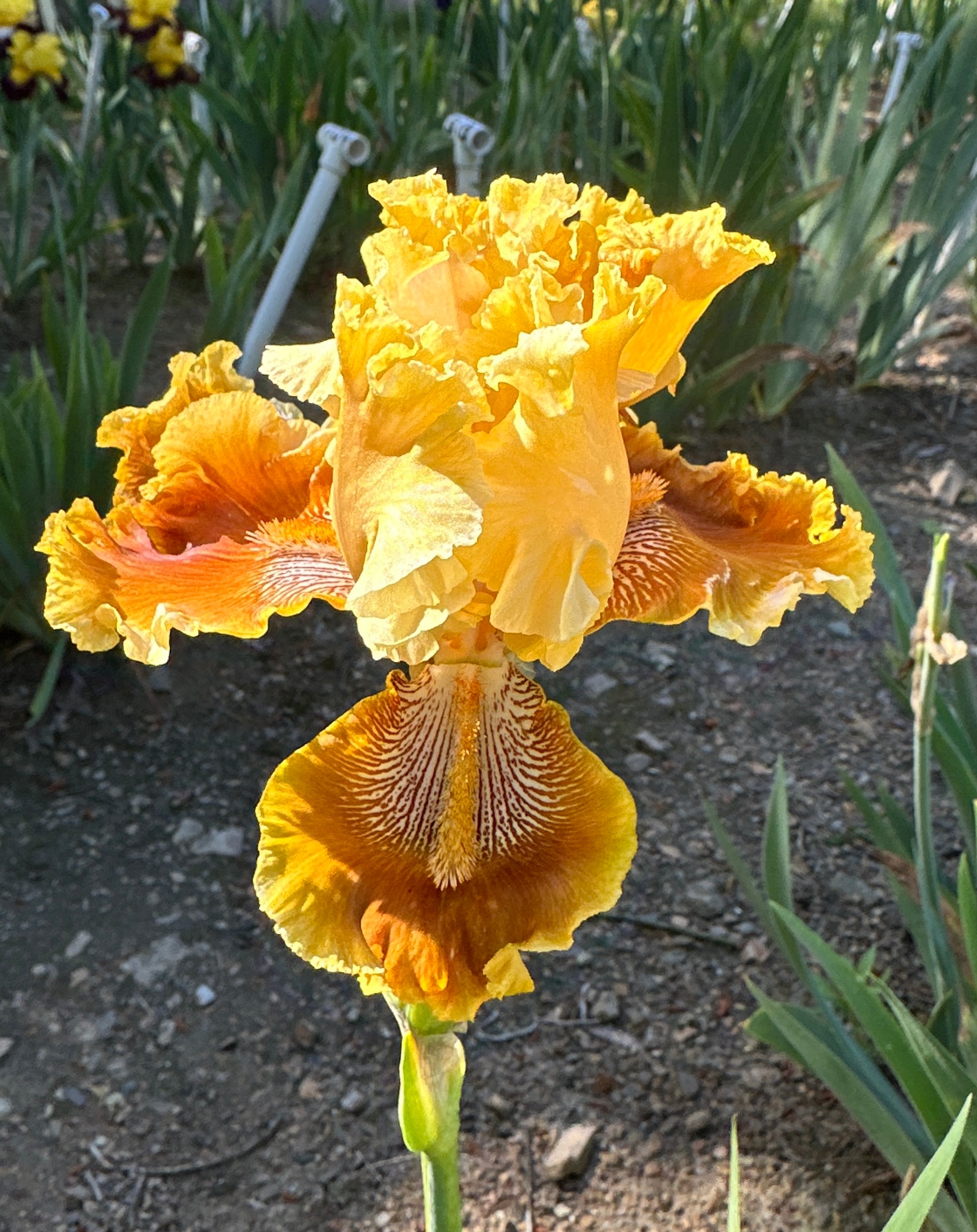 Honey House - (Barry Blyth, R. 2002). Seedling# H51-3. TB, 38" (97 cm). Midseason to late bloom. Standards lemon yellow, deeper yellow around midrib, 1/4" edge; falls yellow overlaid light tan deepening slightly at haft with few white haft marks, creamy lemon 1/4" blended edge; beards white tipped old gold; heavily ruffled; sweet fragrance. Parentage: 'Power Of One' X 'Noble Contessa'. Tempo Two 2002/03.
