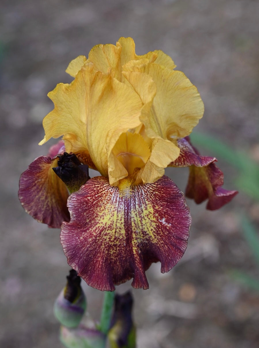 Hot To Trot - (James McWhirter, R. 1991). Seedling# J85-8-2. TB, 38" (97 cm). Early to midseason bloom. Standards deep golden yellow; falls red burgundy mahogany over white ground; beards gold, tipped yellow; slight fragrance. Parentage: 'Gigolo' X 'Captured Beauty'. Cottage 1991. Honorable Mention 1993.