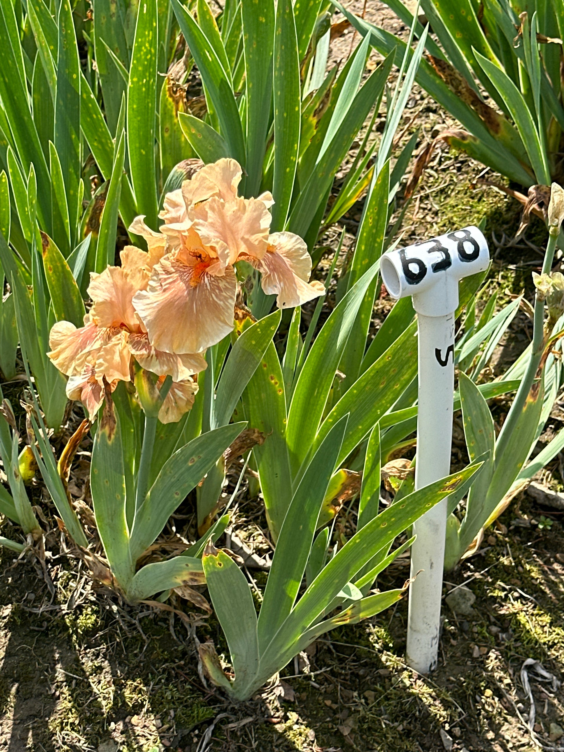 Hyenasicle - (Kathie Kasperek, R. 1996). Seedling# 92B-55R. TB, 31" (79 cm). Early to midseason bloom. Standards and style arms Spanish orange (RHS 26D); falls blended Spanish orange and greyed red (180C/D); beards dark orange; lightly ruffled; slight fragrance. Parentage: 'Baboon Bottom' X 'Raspberry Fudge'. Superstition 1998. Honorable Mention 2000. Novelty Iris.