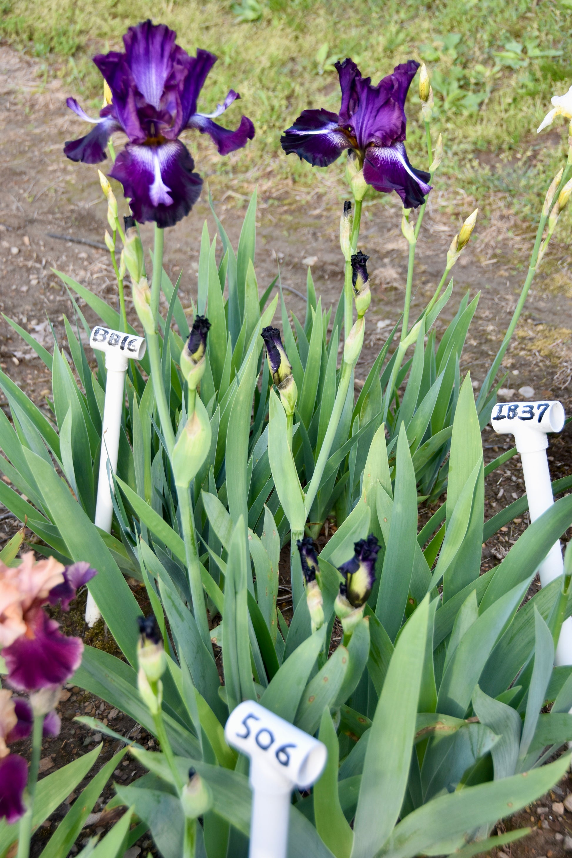Inky Icon - (Tom Burseen, R. 2003). Seedling# 97-569B. TB, 35" (89 cm), Midseason to late bloom. Standards dark purple (RHS 79D); style arms dark bronze purple; falls dark plum purple (79A), hafts striated white; beards dark purple, large white spoon edged purple at tip; ruffled; slight fragrance. Parentage: 'Grand Style' X 'It Ain't So'. TB's Place 2004.