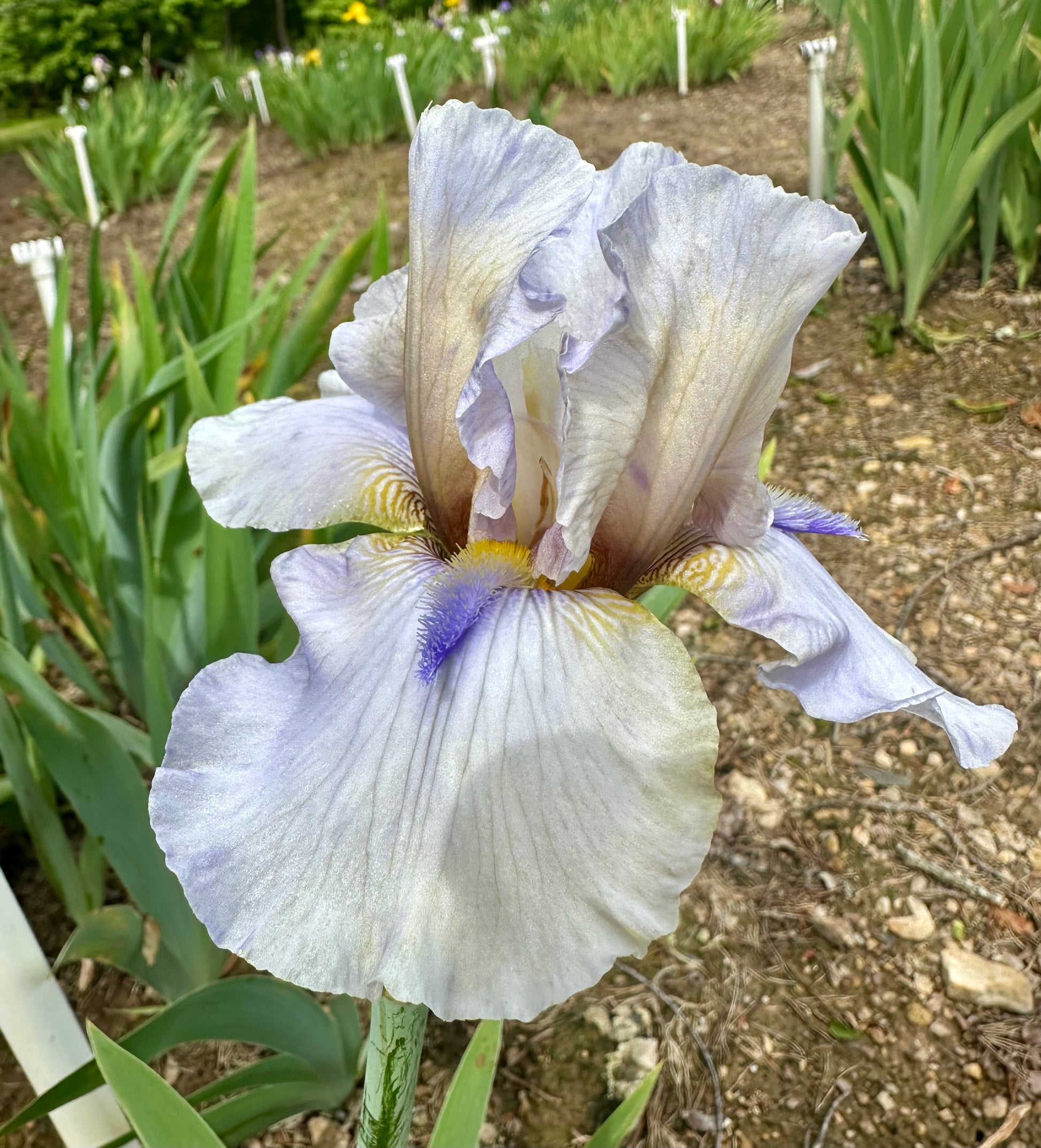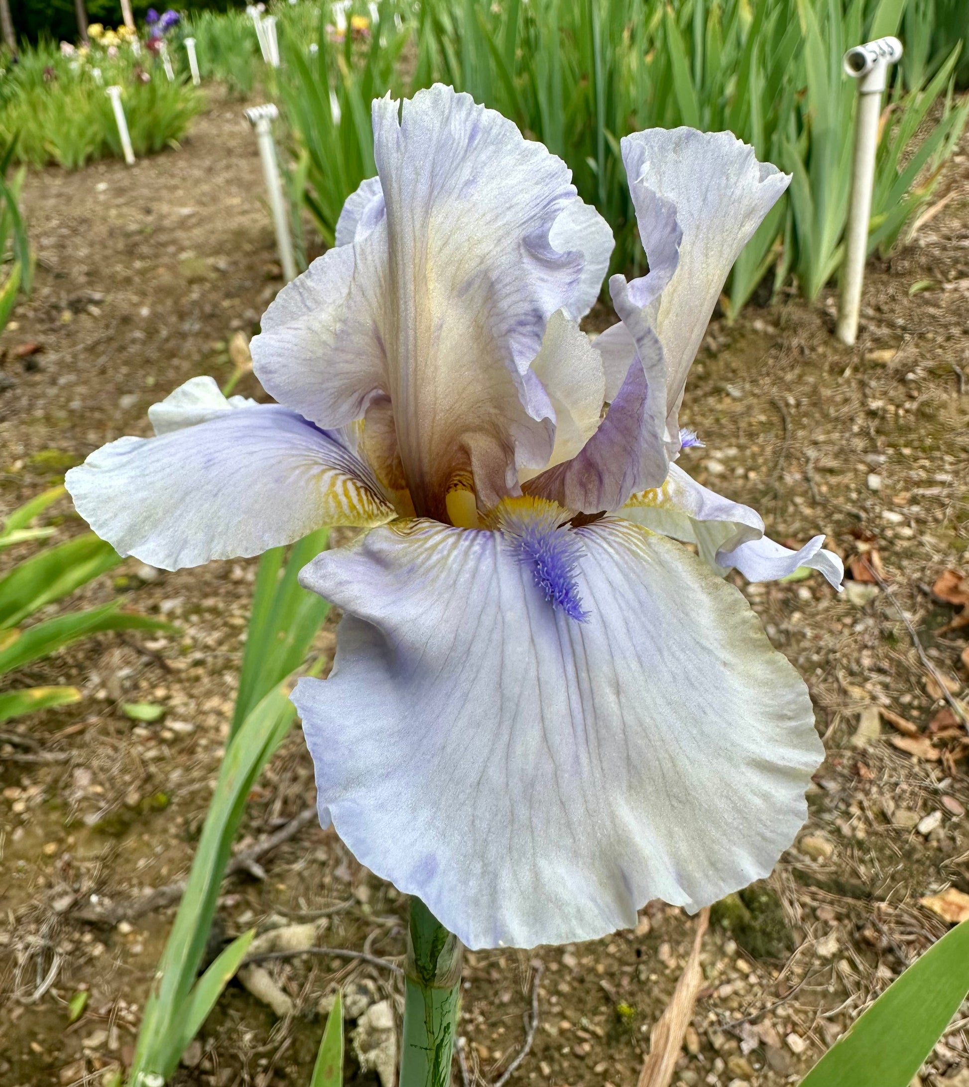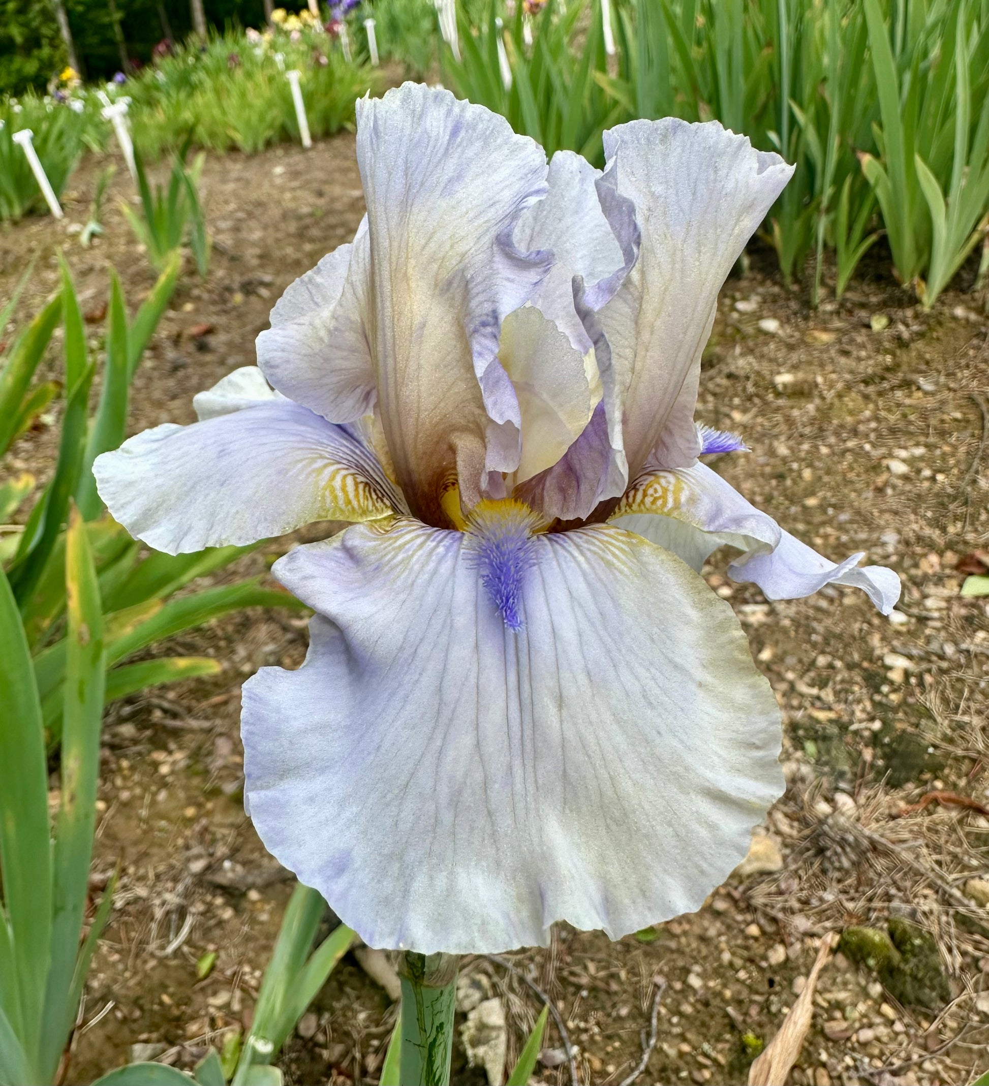 Iron Eagle - (George Sutton, R. 1999). Seedling# H-214. TB, 37" (94 cm). Late midseason bloom and re-bloom. Standards off-white with antique gold midrib; style arms pale lavender white; falls pale lavender white, near light grey; beards antique gold with confederate blue base and horn; slight musky fragrance. Parentage: 'Cloud Baron' X 'Dashing'. Sutton 2000. Honorable Mention 2004. Rebloom reported in: CA, NM, TX. USDA Zones 8, 9.