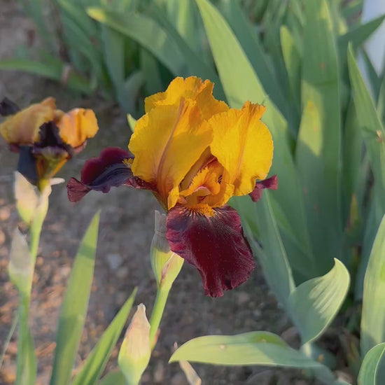 Orageux - (Richard Cayeux, R. 1995). Seedling 8905 C. IB, 22" (55 cm). Midseason bloom. Standards copper yellow; falls red black; beards copper. 'Rabbit's Foot' X 'Broadway'. Cayeux 1996.