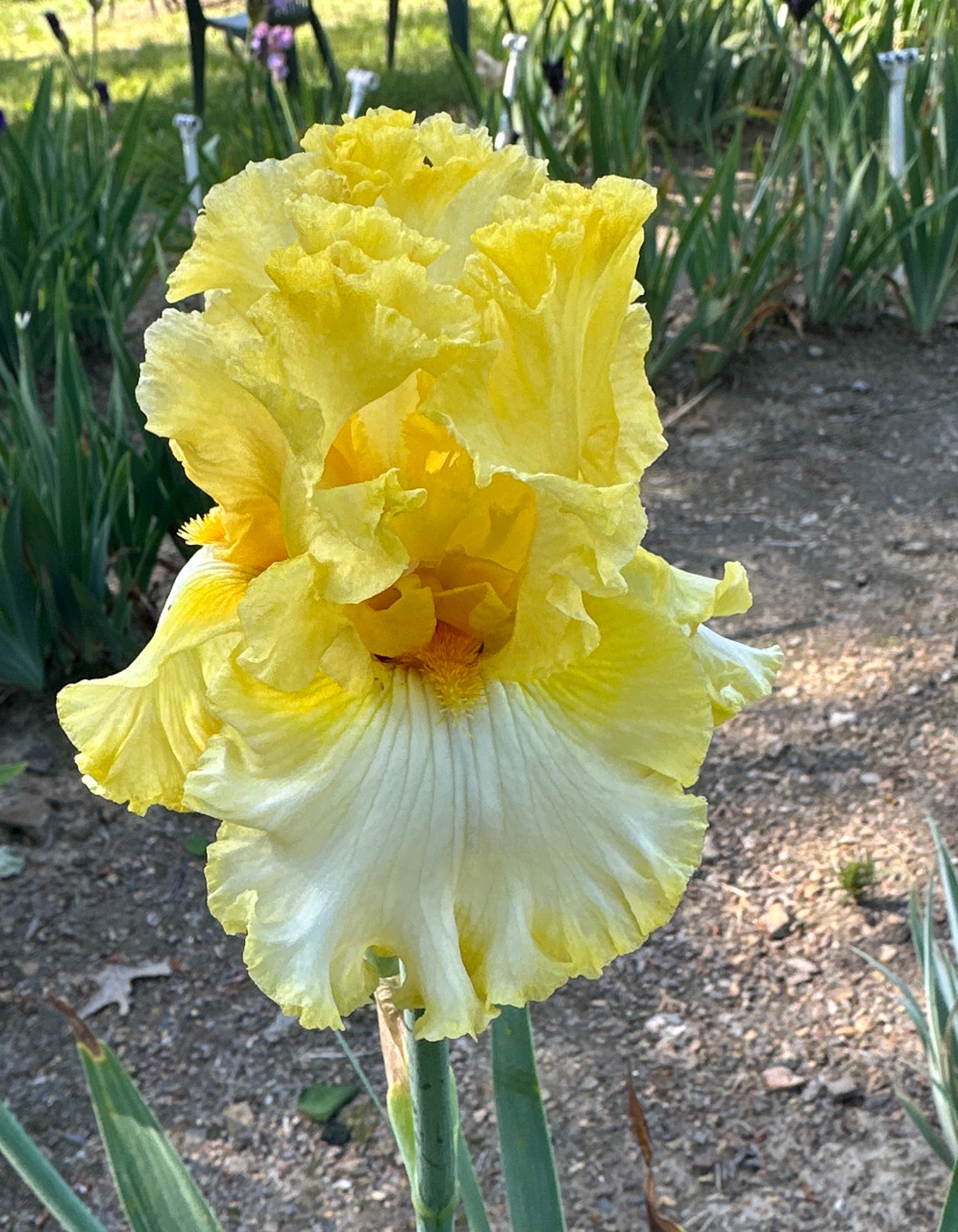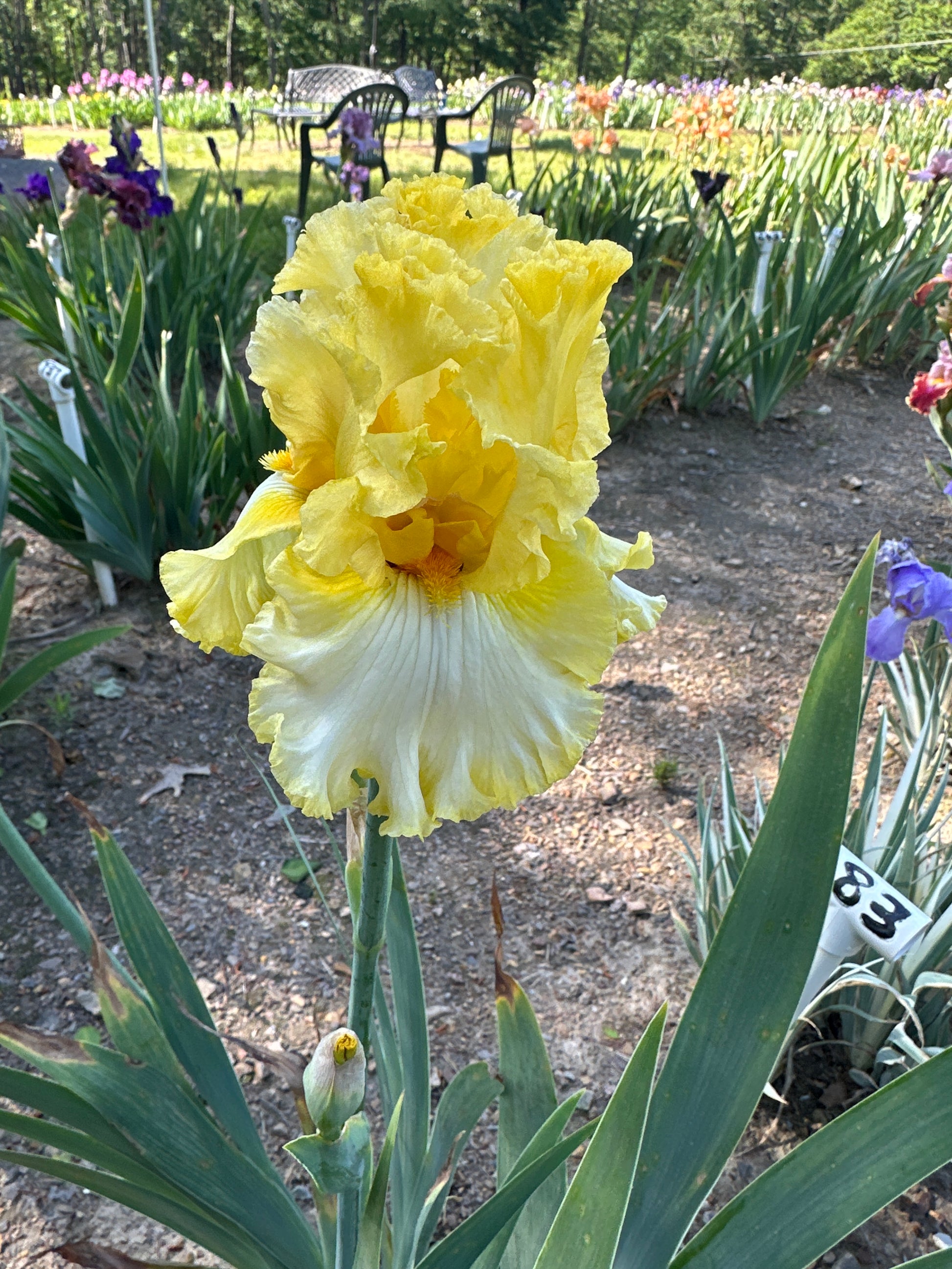 Positive Attitude - (Michael Sutton, R. 2016). Seedling# Z-5001-A. TB, 38" (97 cm), Midseason to very late bloom. Standards and style arms primrose yellow; falls white with primrose yellow edge; shoulders dresden yellow; beards lemon-yellow; ruffled. 'Mimosa' X 'Lemon Bubbly'. Sutton 2017.