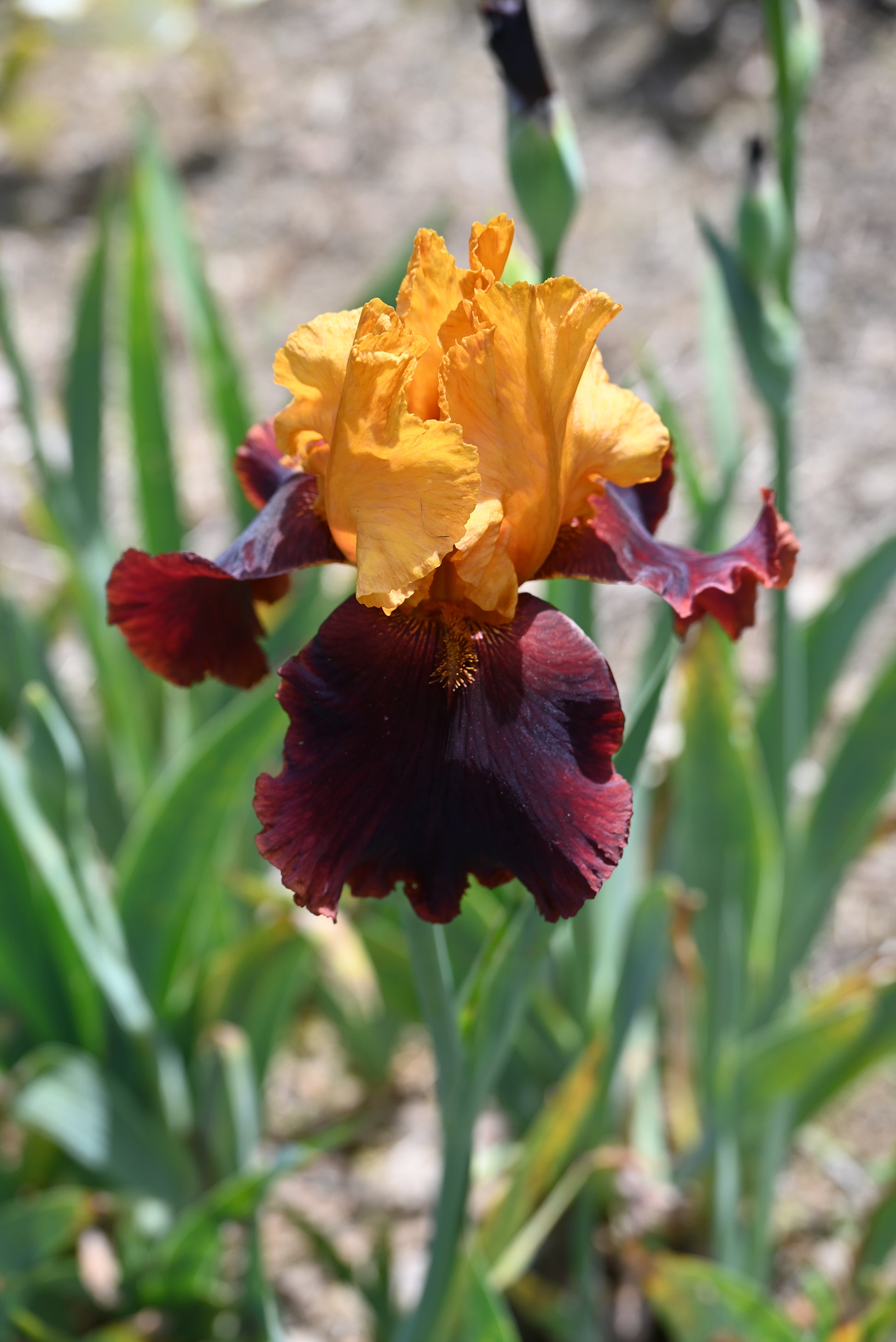 Supreme Sultan - (Schreiner, R. 1987). Seedling# S 830-2. TB, 40" (102 cm). Late midseason bloom. Standards indian yellow (HCC 6/1); falls chrysanthemum crimson (824); indian yellow beard; ruffled and laced. 'Gallant Moment' X 'Peking Summer'. Schreiner 1988. Honorable Mention 1990, Award of Merit 1992. Rebloom reported in: CA. USDA Zones 9.