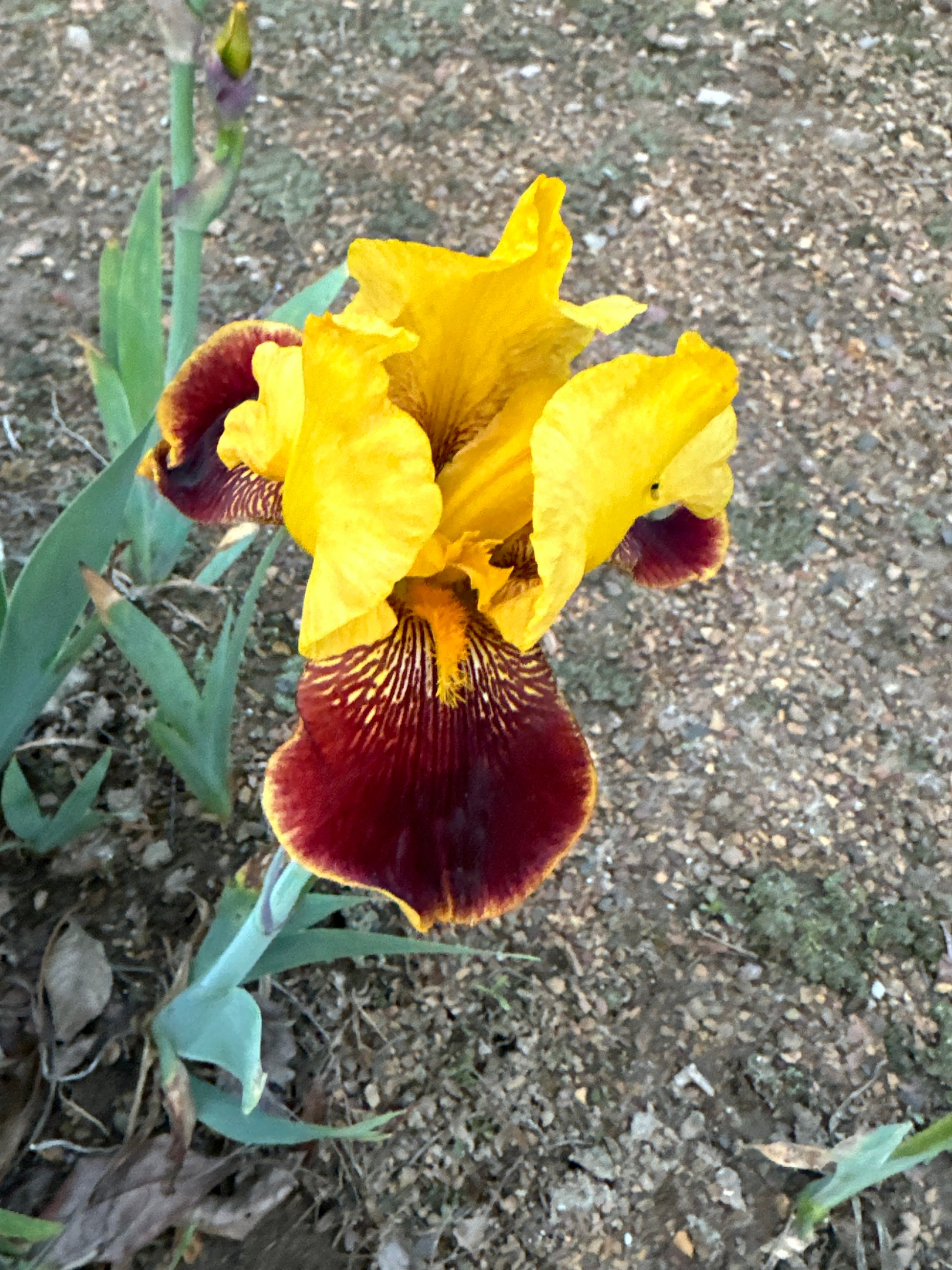 Whoop 'Em Up - (Dovie Brady, R. 1973). Seedling #B-BP-67-93. BB, 27" (69 cm). Early to late bloom. Standards golden yellow; falls maroon with golden yellow on reverse side extending to top as all around edge; yellow beard. ('Bang' x 'Plunder') X 'Extravaganza'. Skyline Iris 1974. Honorable Mention 1976, Award of Merit 1978; Knowlton Medal 1981.