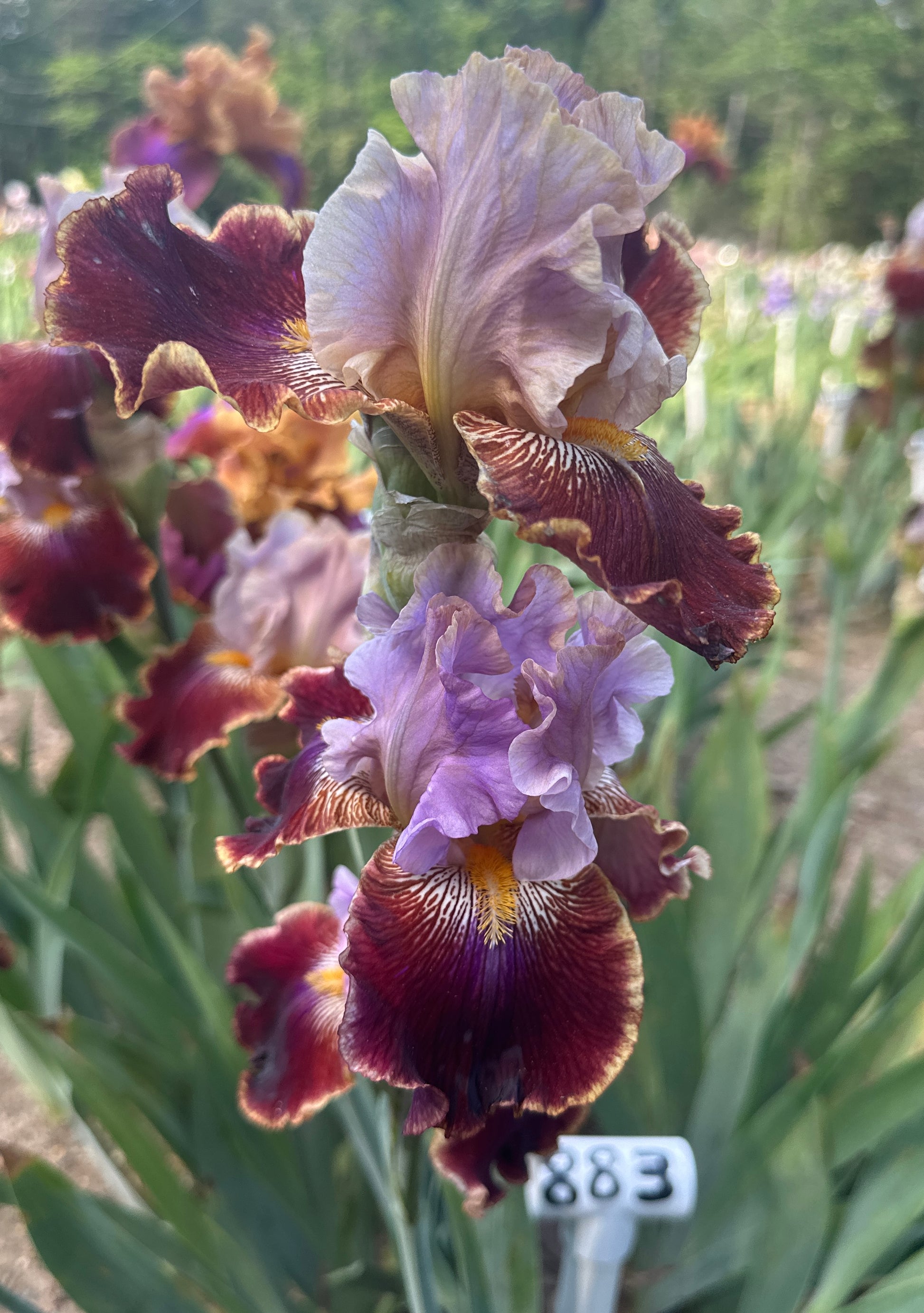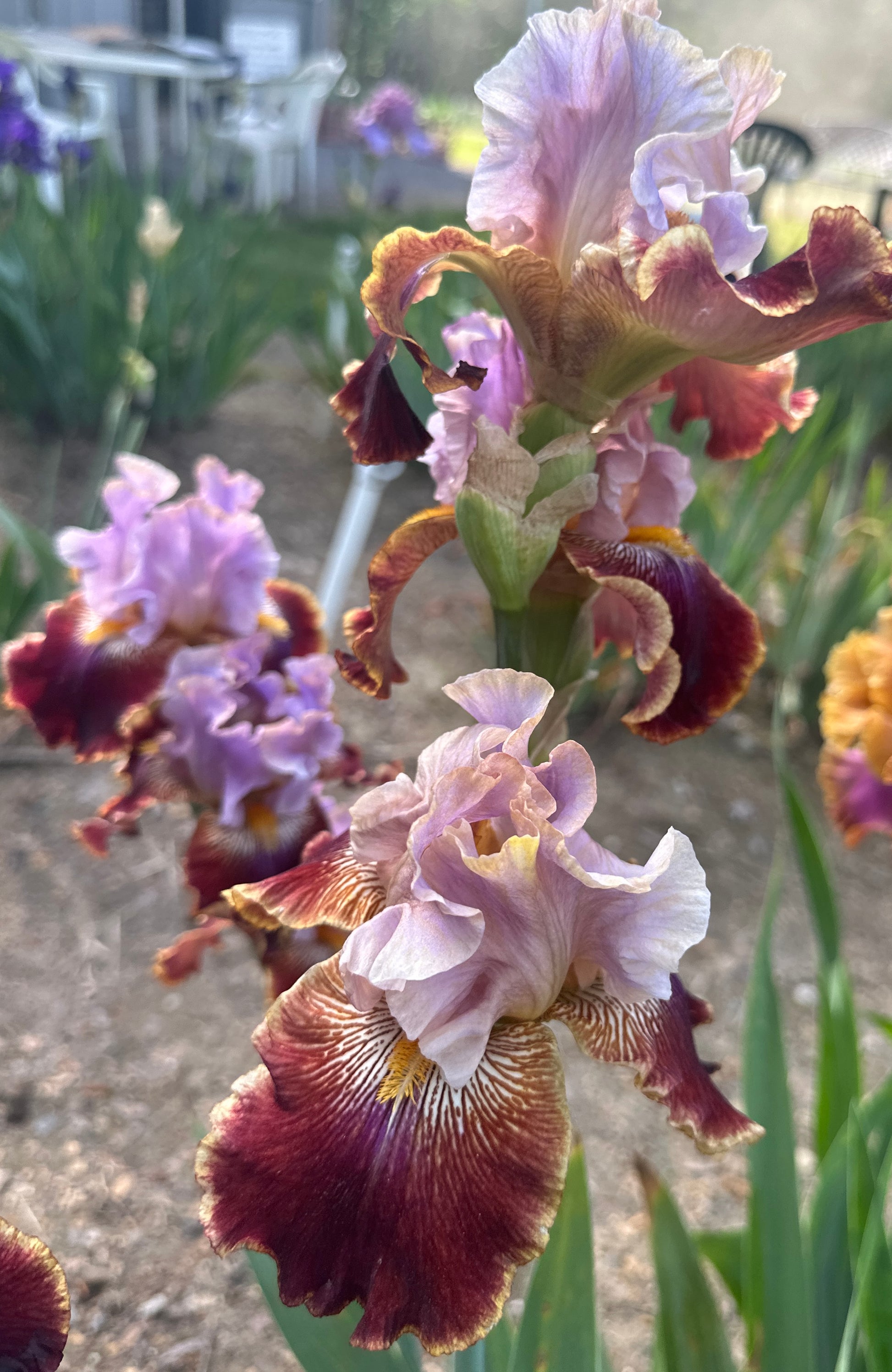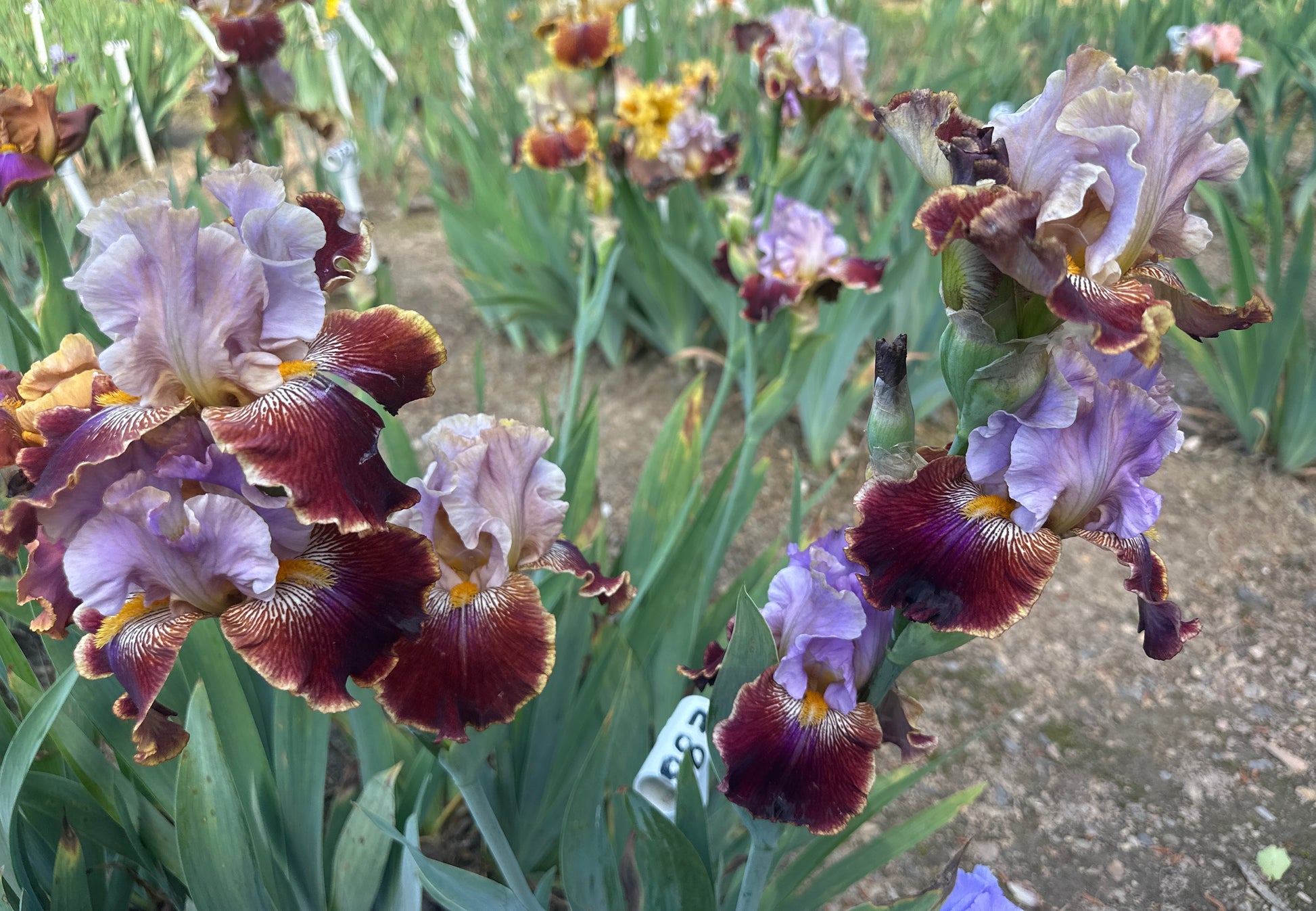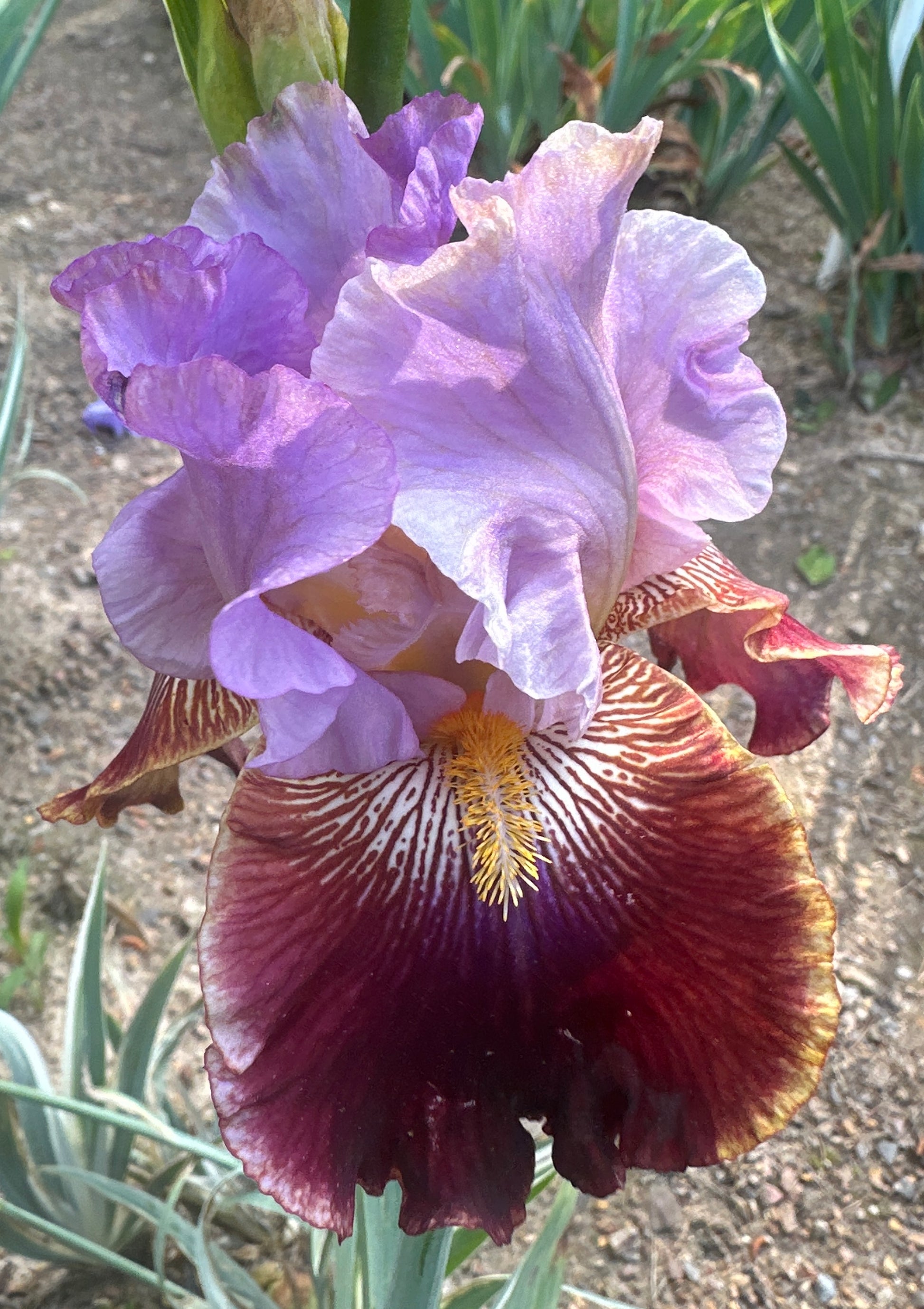 Wisteria Lane - (Augusto Bianco, R. 2008). Seedling# 966. TB, 35" (90 cm). Late bloom. Standards wisteria; style arms golden sand; falls magenta edged gold; beards orange; slight spicy fragrance. Seedling# 920 sibling: ('Plum News' x seedling# 441-01: (seedling# 882: (seedling# 794-sibling: (seedling# 615: 'Winter Adventure' x 'Undersea Adventure') x ('Lady Friend' x seedling# 430: ('Olympiad' x 'Undersea Adventure'))) x seedling# 787) x seedling# 153-96, 'Mansonia' pollen parent)) X 'Confusione'. Iride 2009.